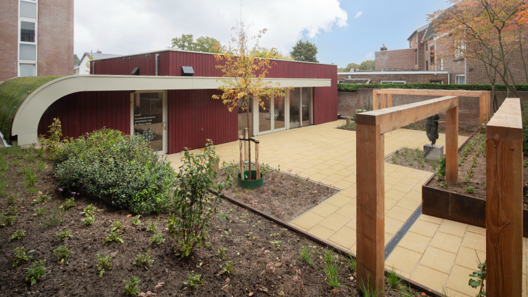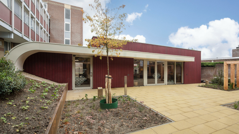 Nieuwbouw ontmoetingsruimte met aparte scootmobielstalling