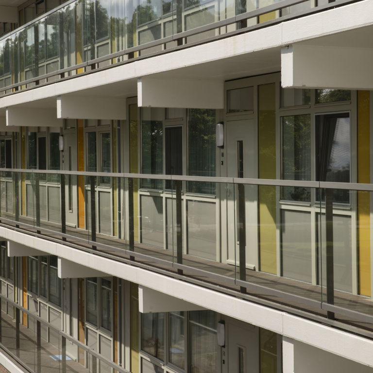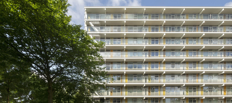 Ook hebben we de uitstraling, de toegankelijkheid en levensloopbestendigheid van de flat verbeterd. Hiervoor hebben de gevels een facelift gekregen en zijn alle drempels naar de galerijen en balkons verwijderd. De (brand)veiligheid hebben we verbeterd door een voorziening te creëren voor het stallen en opladen van scootmobielen.